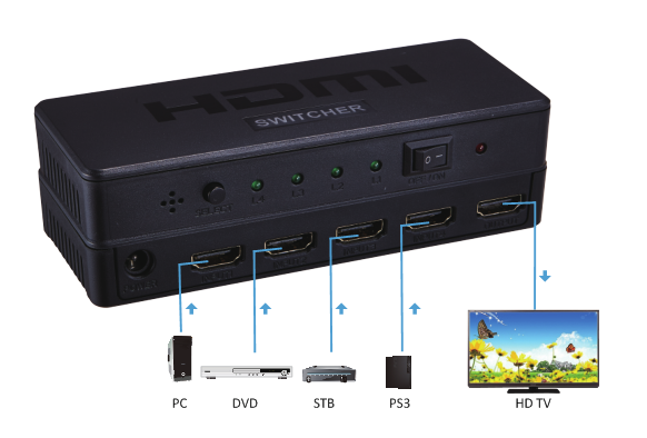 Permite cambiar 4 puertos HDMI a un solo terminal mediante los botones del mando. El Yatek YK-0401B también puede colocarse al final de un largo cable HDMI para regenerar la señal HDMI. Este switch HDMI soporta formatos de vídeo de 720p, 1080i y 1080p.
